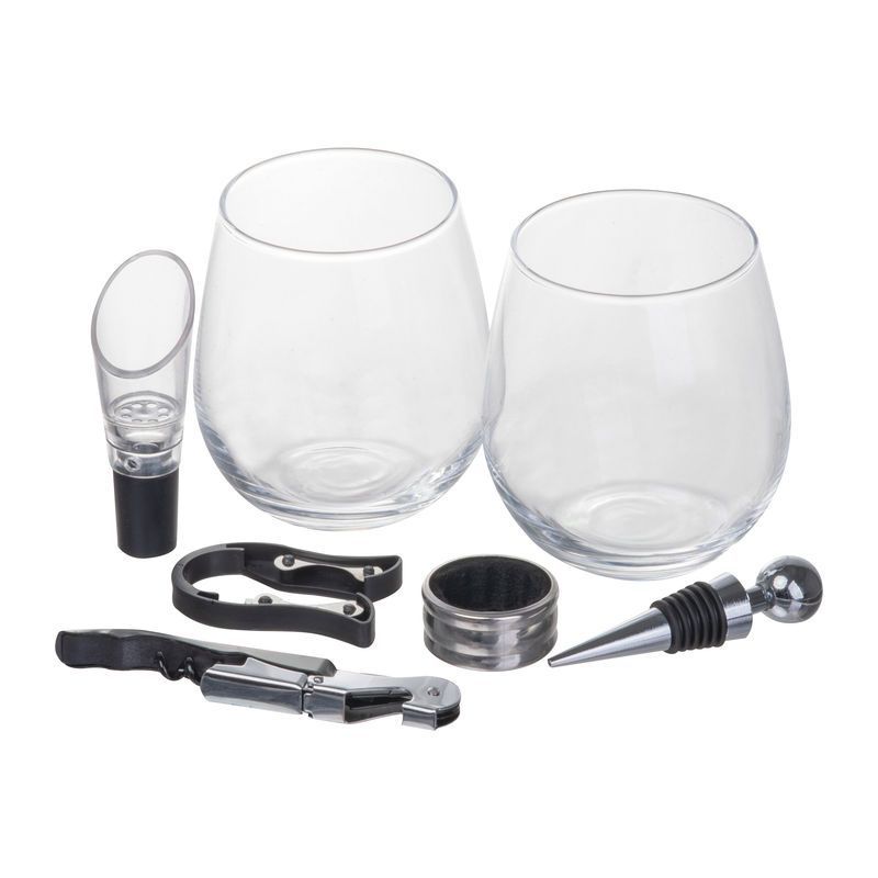 Komplexná vínna sada s dvoma pohármi, vývrtkou, zátkou, nalievacím krkom, vínovým krúžkom a odvíjačom fólie. Sada 2 sklenených pohárov, každý s objemom 440 ml