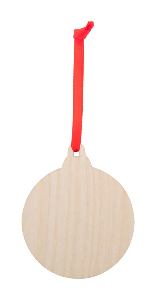 Vianočná ozdoba z brezovej preglejky s potlačeným vianočným vzorom a červenou stuhou, ktorá sa dodáva samostatne.
