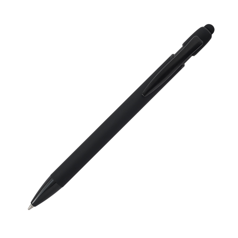 Hliníkové kuličkové pero s pogumovaným saténovým povrchem příjemným na dotek a modrou náplní. Vybaveno dotykovým perem (stylusem) a černými doplňky.