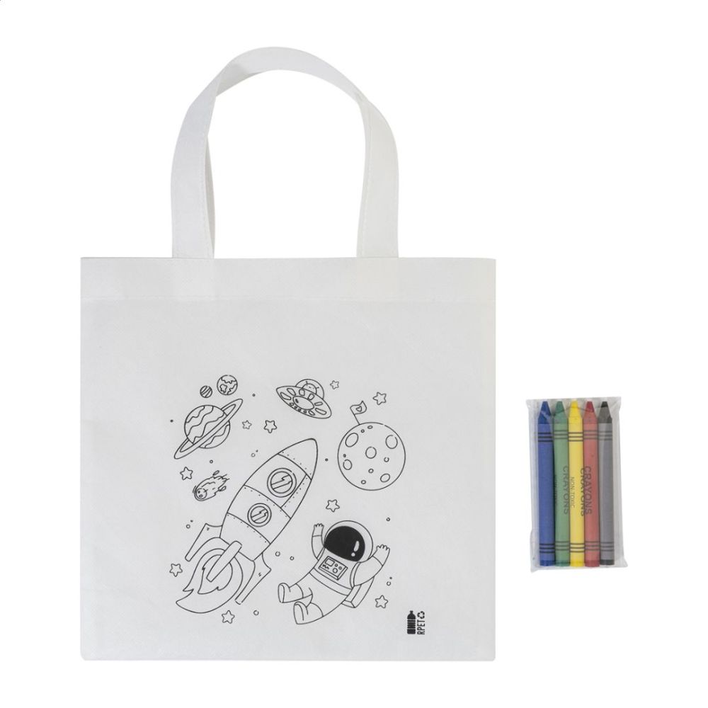 Mini nákupná taška z netkanej RPET tkaniny s 5 voskovkami na vyfarbenie.