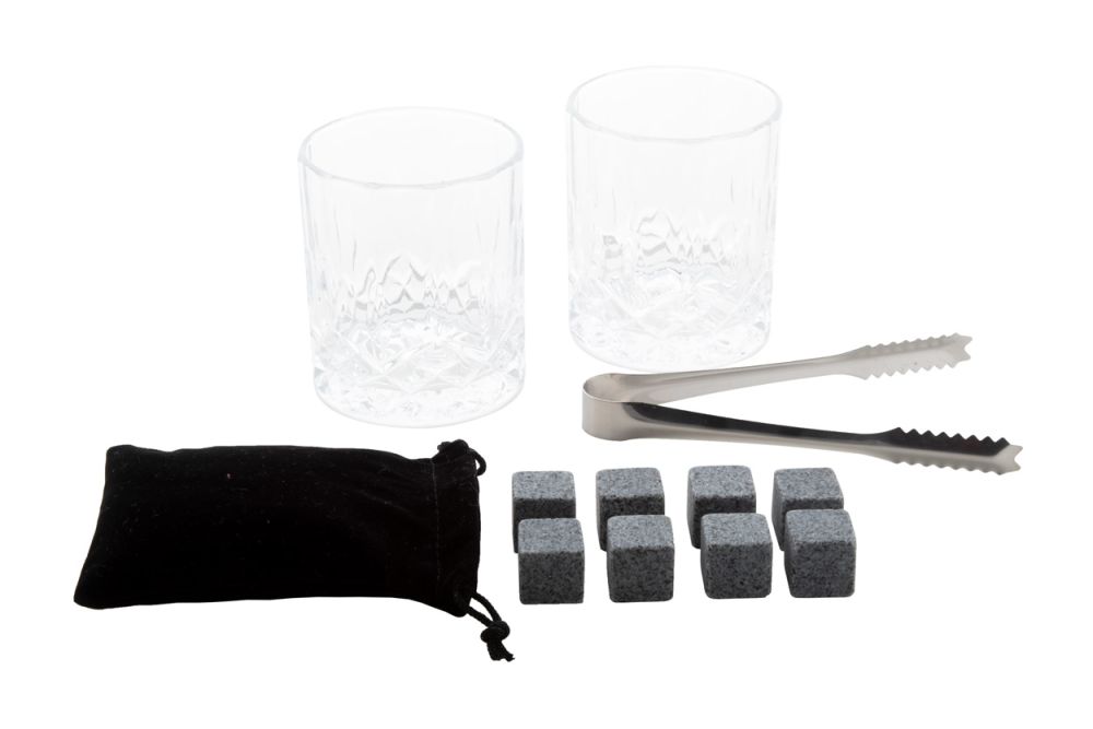 Luxusný whisky set v darčekovej krabičke z bambusu. Obsahuje 2 poháre na whisky (250 ml), 8 opakovane použiteľných kamenných kociek ľadu s úložným puzdrom a nerezové kliešte.