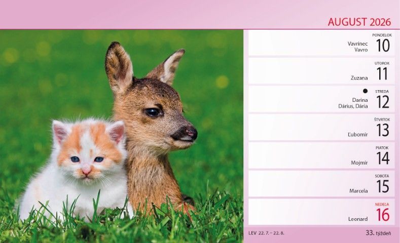 Týždenný stolový kalendár Priatelia prináša krásne a milé fotografie zvieracích priateľov: psíkov, mačiek, zajačikov, vtáčikov a ďalších obľúbených domácich zvierat. Každý týždeň Vám spestrí nový zvierací kamarát, ktorý vyčarí úsmev na tvári a spríjemní pracovný či domáci deň. Ideálny darček pre deti ale aj všetkých milovníkov zvierat.