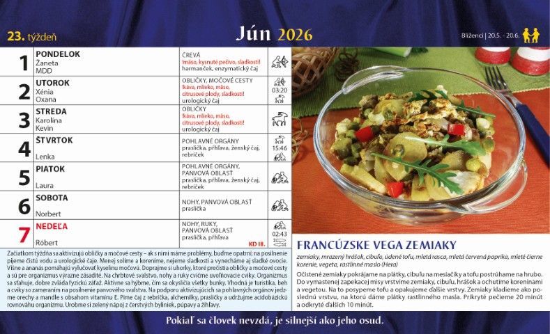 Stolový kalendár zostavený podľa mesačných fáz je určený pre každého, kto túži žiť v súlade s prírodou, načúvať svojmu telu. Na každý týždeň ponúka praktické rady ovplyvnené aktuálnou fázou Mesiaca: čo robiť, čomu sa vyhnúť, ako podporiť vitalitu, imunitu či psychickú pohodu. Navyše kalendár obsahuje zdravé recepty, ktoré zohľadňujú lunárne cykly a prirodzené potreby organizmu.