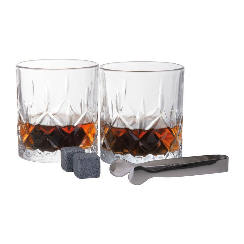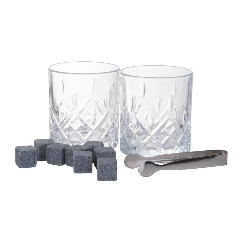 Whiskey sada s dvoma pohármi z borosilikátového skla, 6 granitových kociek ľadu a kliešťami v prémiovej bambusovej krabičke. Sada 2 sklenených pohárov, každý s objemom 250 ml