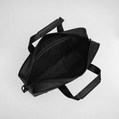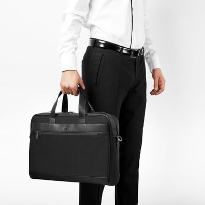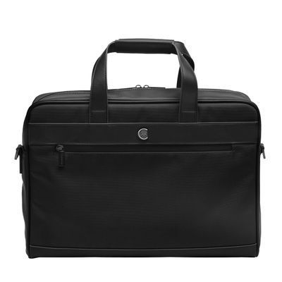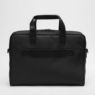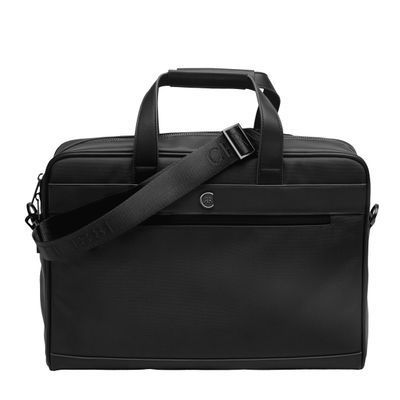 Minimal, elegant and understated the Bond travel collection is mixing contemporary nylon with luxurious vegan leather texture for a result that is easy to wear and match with any outfit. The bags are signed with a matt version of our CRR plate. All details are carefully though about : from zippers with engraved logo to an oversized yet subtle CERRUTI 1881 signature embossed on the side of the bag. This item is also very functional : roamy and easy to organise with a lot of zipped compartment. The inside of the bag is padded to best protect your laptop. It is available in 2 color versions : All black, or mixing brown and grey for a resolutely chic result.