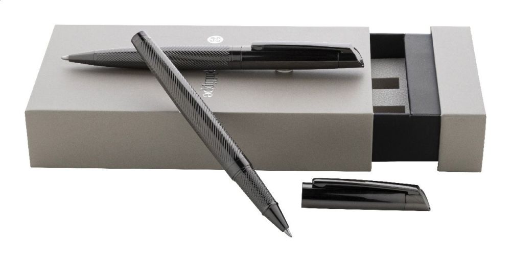 Elegantná sada kovového guľôčkového pera a rollera s diagonálne textúrovaným telom. V dvojfarebnej darčekovej krabičke s modrou náplňou. Produkt značky André Philippe.