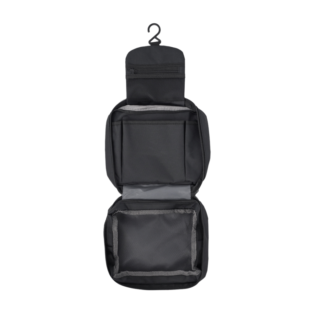 Odolná a prostorná kosmetická taška se zapínáním na zip. Je vybavena háčkem na zavěšení, dvěma síťovanými kapsami se zapínáním na zip a čtyřmi otevřenými, hlubokými přihrádkami. Vybavení není součástí.