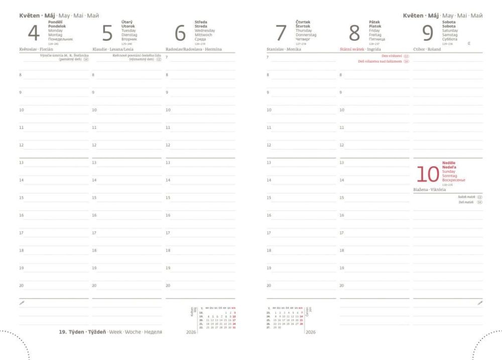 Diár obsahuje: osobné údaje, plánovač dovolenky (mesačný prehľad), plánovací kalendár, telefónne predvoľby, štátne sviatky Českej a Slovenskej republiky, medzinárodné sviatky, ročný výhľad, týždenný layout, adresár, mapa Európy a Českej a Slovenskej republiky