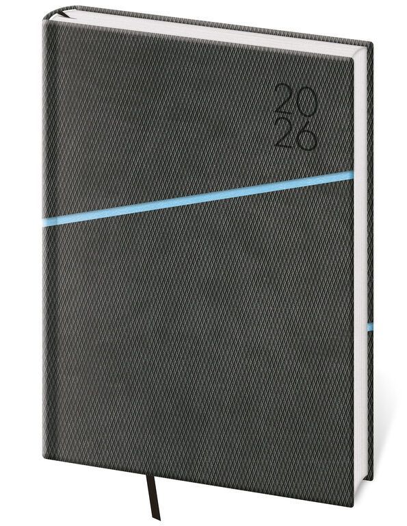Dosky diára GRIFE sú vyrobené prevažne z šedej matnej a štruktúrovanej koženky. Preto neodporúčame sleporazbu loga s jemnými znakmi. Šedá koženka je ozdobená farebným pruhom.