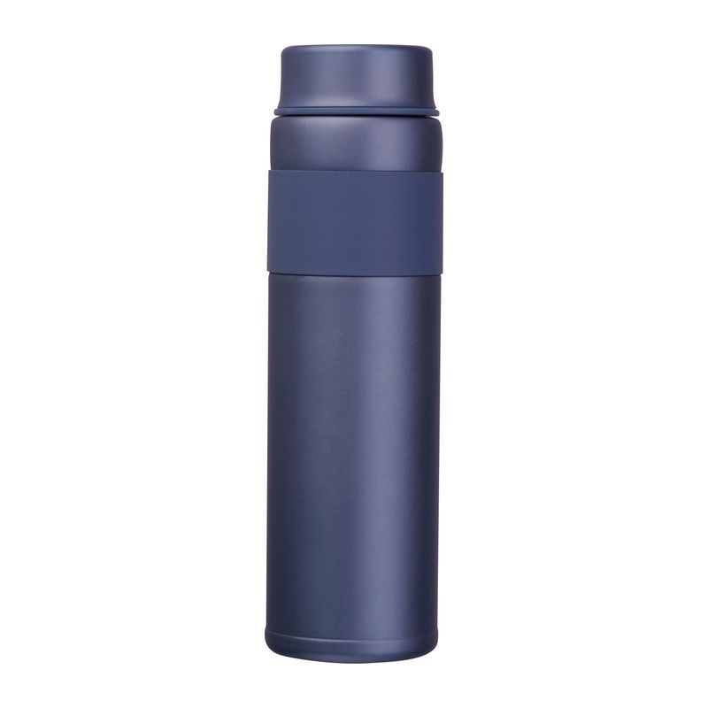 Dvojstenná vákuová nerezová termoska, 600 ml, ergonomický dizajn s farebne zladeným PU pásikom pre pohodlný úchop.