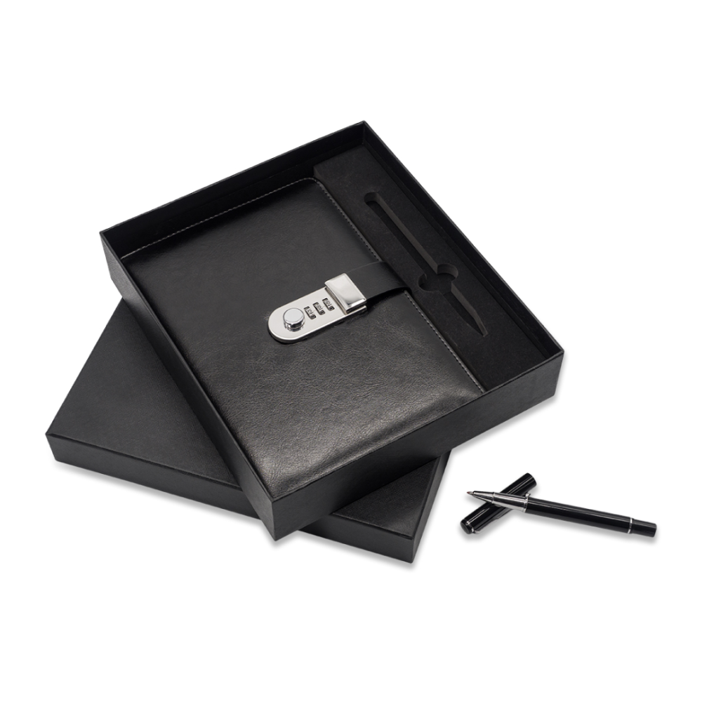 Dárková sada obsahující elegantní vyměnitelný zápisník (100 linkovaných stran, 80 g/m2) s vazbou z PU s kombinačním zámkem a kuličkové pero s modrou náplní. Sada je balená v dárkové krabičce.