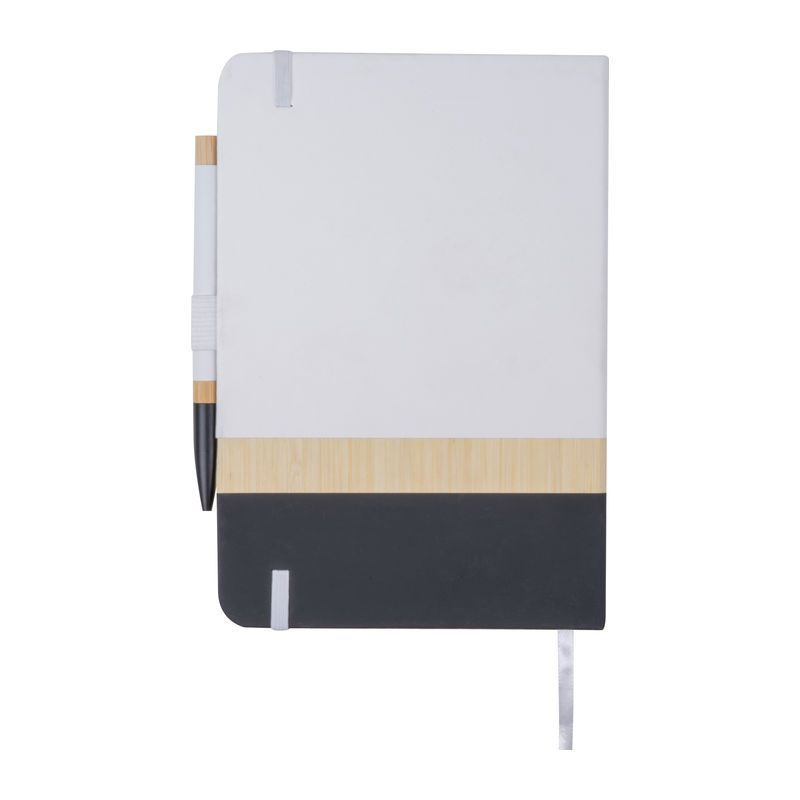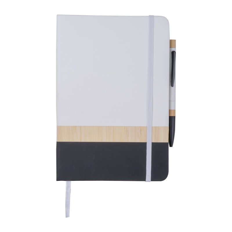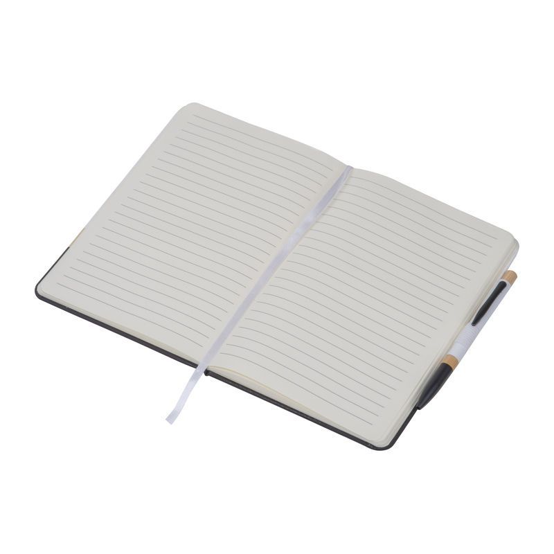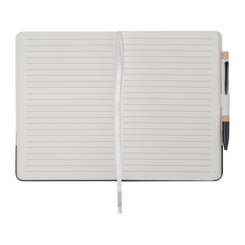 Zápisník A5 s perom. Zápisník je vyrobený z recyklovaného papiera (160 linajkovaných strán), bambusu a PU. Pero v rovnakom dizajne, z hliníka a bambusu.