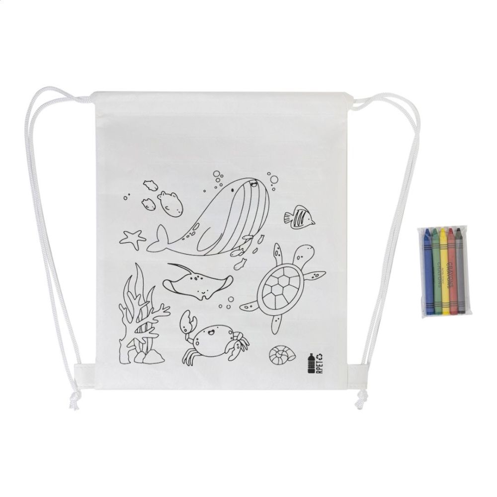Vak so sťahovacou šnúrkou pre deti z netkanej RPET tkaniny s 5 voskovkami na vyfarbenie.
