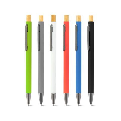 Guľôčkové pero z recyklovaného hliníka (100 % RAL) s gumovým povrchom. Jeho minimalistický dizajn kombinuje matné kovovo šedé detaily a bambusové tlačidlo na vrchole. Má klip a modré písmo. Pri laserovom gravírovaní sa farba personalizácie zmení na striebornú. Keďže výrobok je vyrobený z prírodných materiálov, farba a výsledok tlače sa môžu medzi výrobkami líšiť